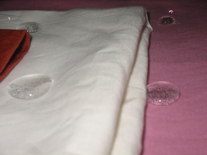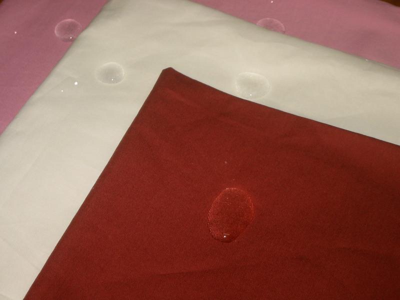 紡織品經過納米技術處理後其表面就產生了一種荷葉效應,水珠在荷葉上滾動,而荷葉不受浸濕。納米技術處理是在紡織纖維的表面永久性粘附上納米材料,因為納米粒子體積極小,它如同絨毛附在纖維的表面是無法用肉眼看得見的,只有用電子顯微鏡才能看得到。納米粒子在纖維的周邊形成一層氣墊,當水打在織物上,它就會在氣墊上形成水珠,滾離布面。如水份受壓穿透織物,水份也不會被織物吸收,因此在流汗時,汗液可利用毛細管芯吸效應,經織物排出體外,保持乾爽及拒水效應。