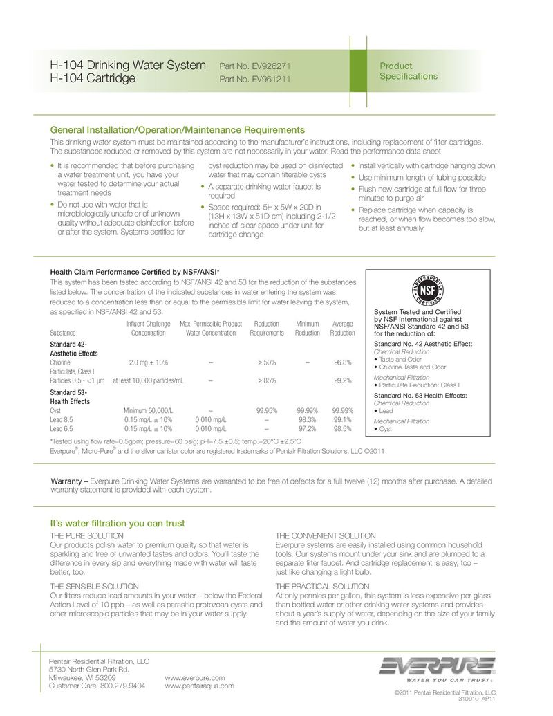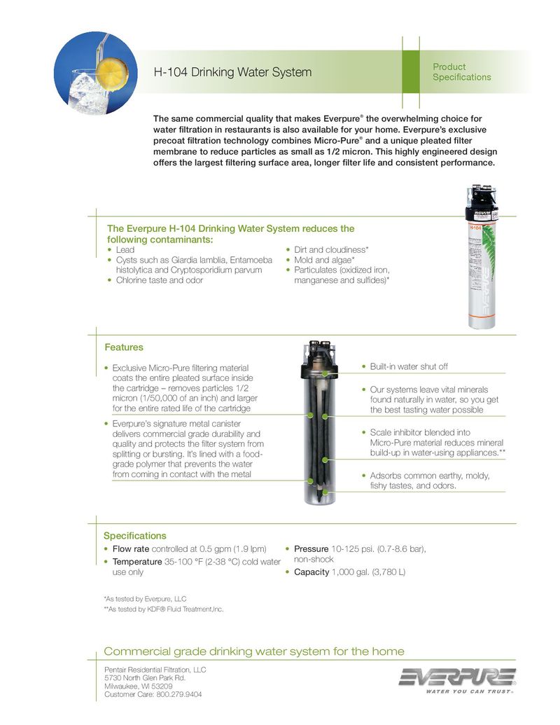 - 型號 : H-104 安裝體積 : 51 x 13 x 13 (cm) 處理水量 : 約 1,000加侖 / 3,780公升 流量 : 約 2公升 / 分鐘 水壓 : 10-125 psi 適合家用 可接駁冷熱飲水機