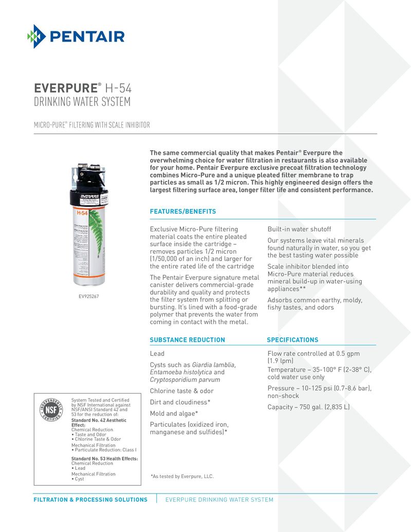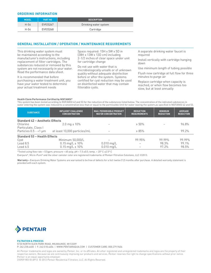 - 型號 : H-54 安裝體積 : 38 x 13 x 13 (cm) 處理水量 : 約 750加侖 / 2,837公升 流量 : 約 2公升 / 分鐘 水壓 : 10-125 psi 適合家用 可接駁冷熱飲水機