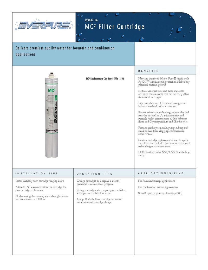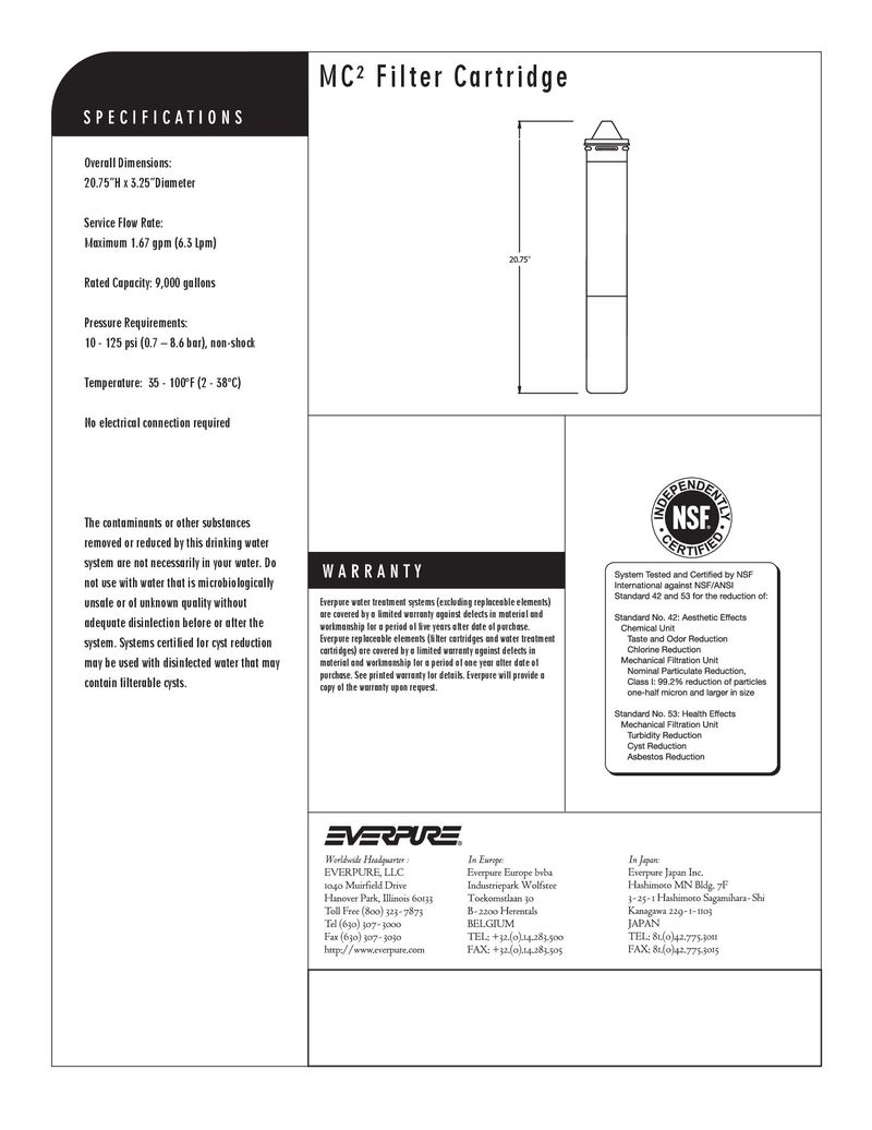 - 型號 : MC2 安裝體積 : 61 x 13 x 13 (cm) 處理水量 : 約 9,000加侖 / 34,000公升 流量 : 約 6.3公升 / 分鐘 水壓 : 10-125 psi 適合家用 / 商用 可接駁冷熱飲水機