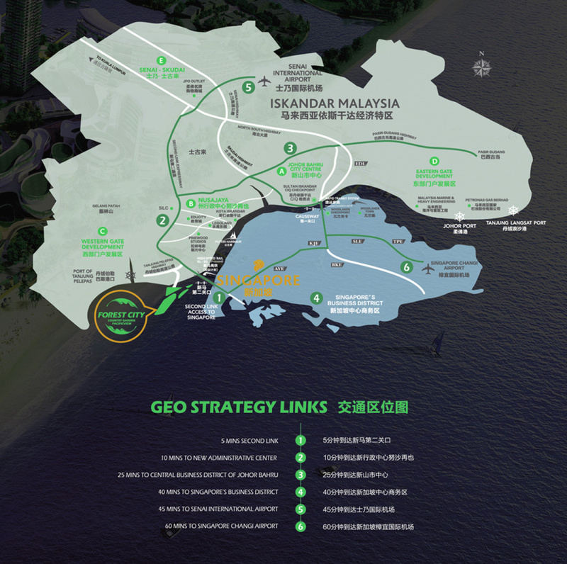 5 mins 新馬第二關口10 mins 新行政中心努沙再25 mins 新山市中心40 mins 新加坡中心商務區45 mins 士國際機場60 mins 新加坡樟宜國際機埸人車分隔,車在地下行駛,地面全是公園先進的分層立體城市分隔理念,地面全是公園和行人道路,没有車輛行駛。,地下兩層為交通道路,另地上亦有架空鐵路,真正做到人車分流。
