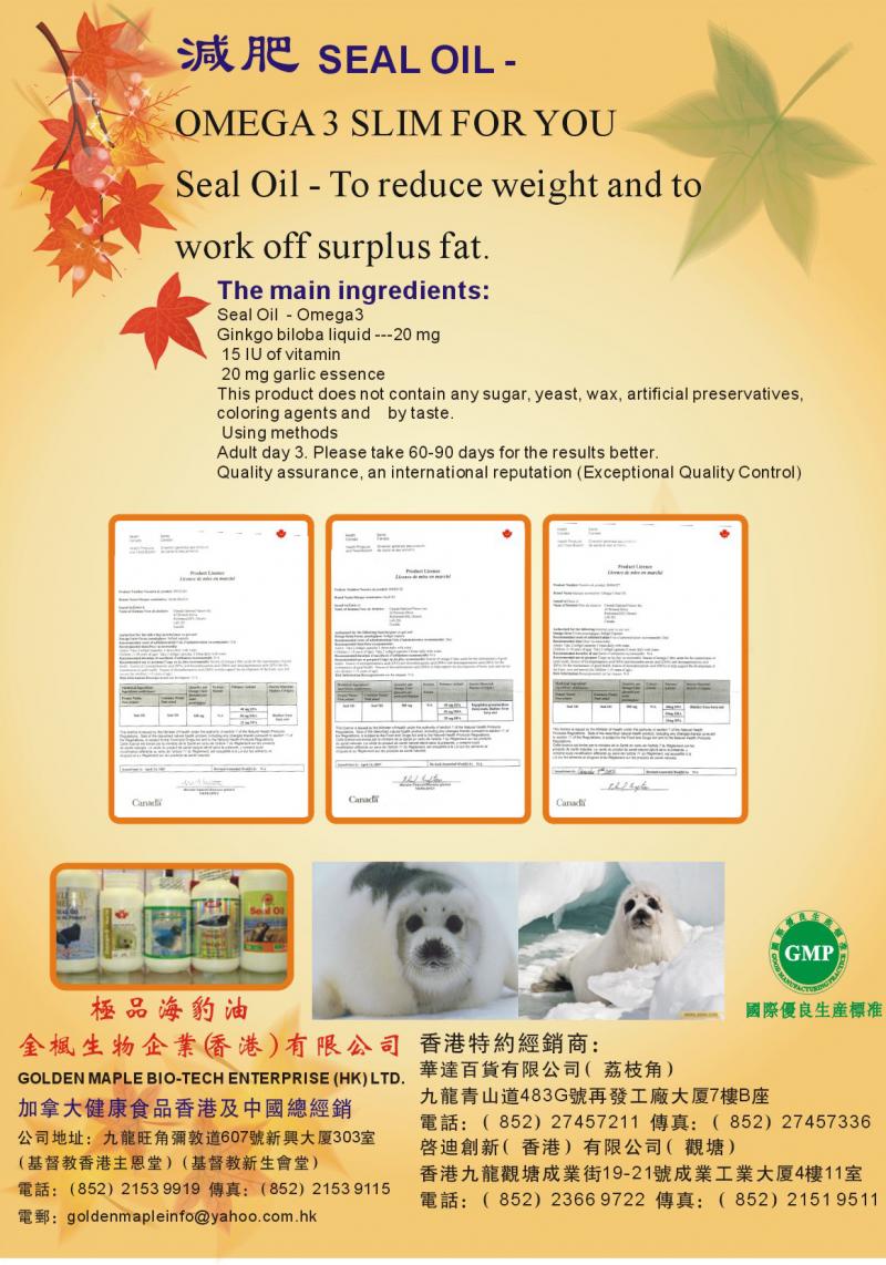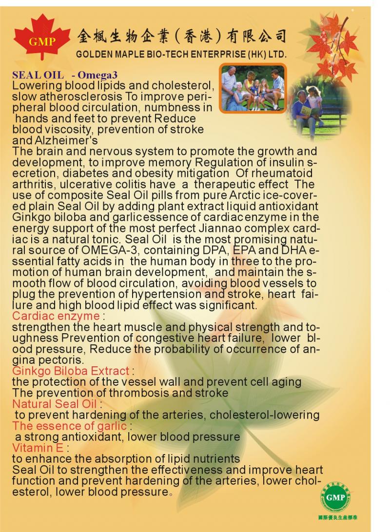 海豹生活在加拿大北部,以北冰洋的鱼類為覓食,體内脂肪中含 Omega-3 。尤其含有魚類所没有的DPA,能够提高人類的免疫力,提高智力水平,尤其對幼兒的生長發育至為重要是。海豹系深海哺乳動物,更易於被人体吸收、利用海豹油能够軟化血管,清除血液中的衰老質,脂肪沉淀·改善血液粘稠度,减少血小板聚集,防止细胞老化,提高智力水平,如長期服用可以可预防及治療心夕病脑血詮,脑中风,高血压、肿瘤及糖尿病、有助于老年痴呆证的控制和治疗.海豹油含“角鲨稀”,能够增强免疫系统,并有杭氧化的作用,并能缓解酒精及病毒引起的肝脏疾等。产品有高度的安全性,纯天然,不含任何防腐剂或人工成分添加。