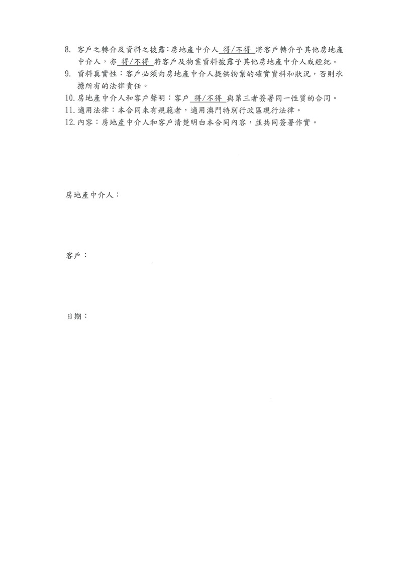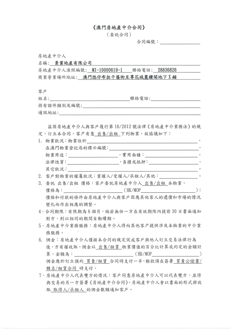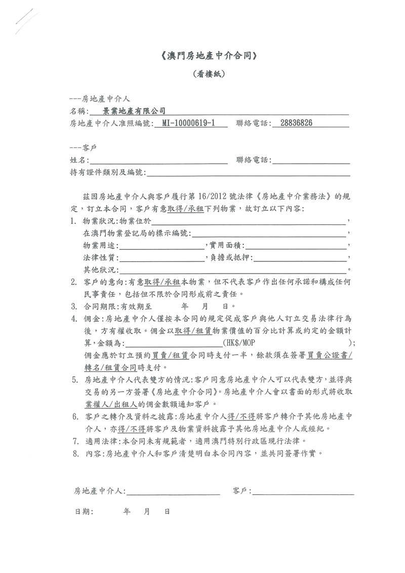 由1/7/2013起澳門房地產中介法正式實施,凡業主或客戶需要放盤或搵盤,需簽立一份中介人合同委託書或看樓紙後,方可替業主宣傳﹑刊登廣告及向客戶推薦樓盤及安排睇樓,本公司誠為閣下服務,現附上中介人合同委託書及看樓紙樣版,請點擊圖片,後右鍵"另存圖片"到電腦,後打印,煩請如實填寫相關資料。